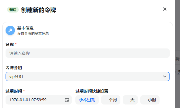 令牌分组选择 VIP 分组,过期时间 永不过期,之后点击提交。