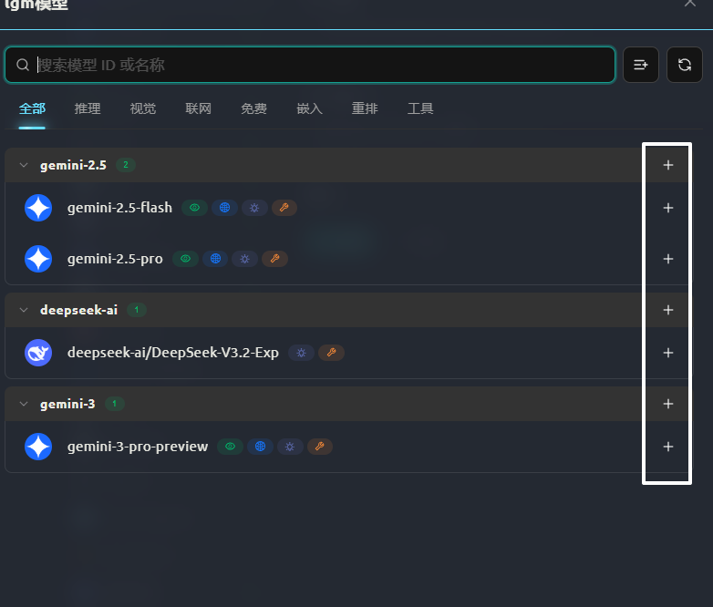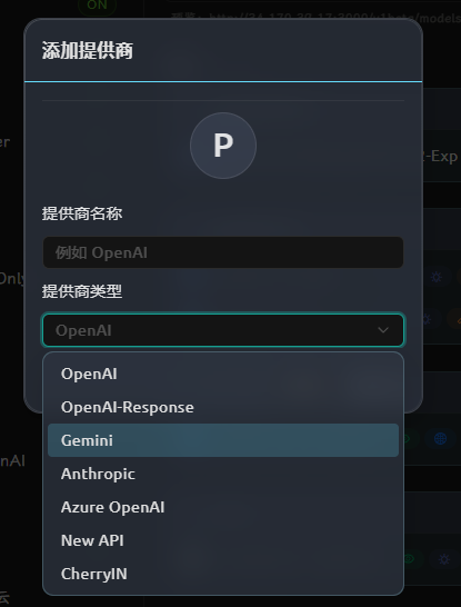 点击最下方 添加 后,供应商选择 Gemini(很重要,选择其他供应商会无法使用联网功能):