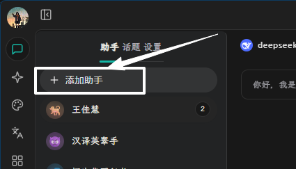 点击 添加助手 ——> 添加助手 ——> 随便取个名字 ——> 右键刚刚生成的助手 ——> 编辑助手
